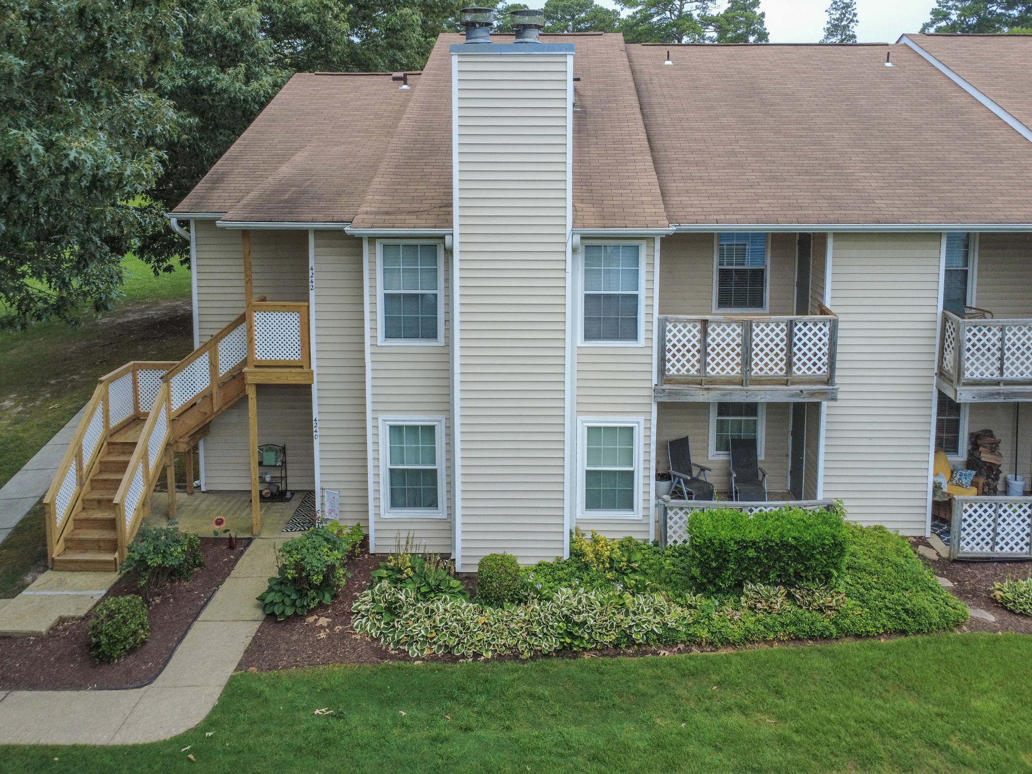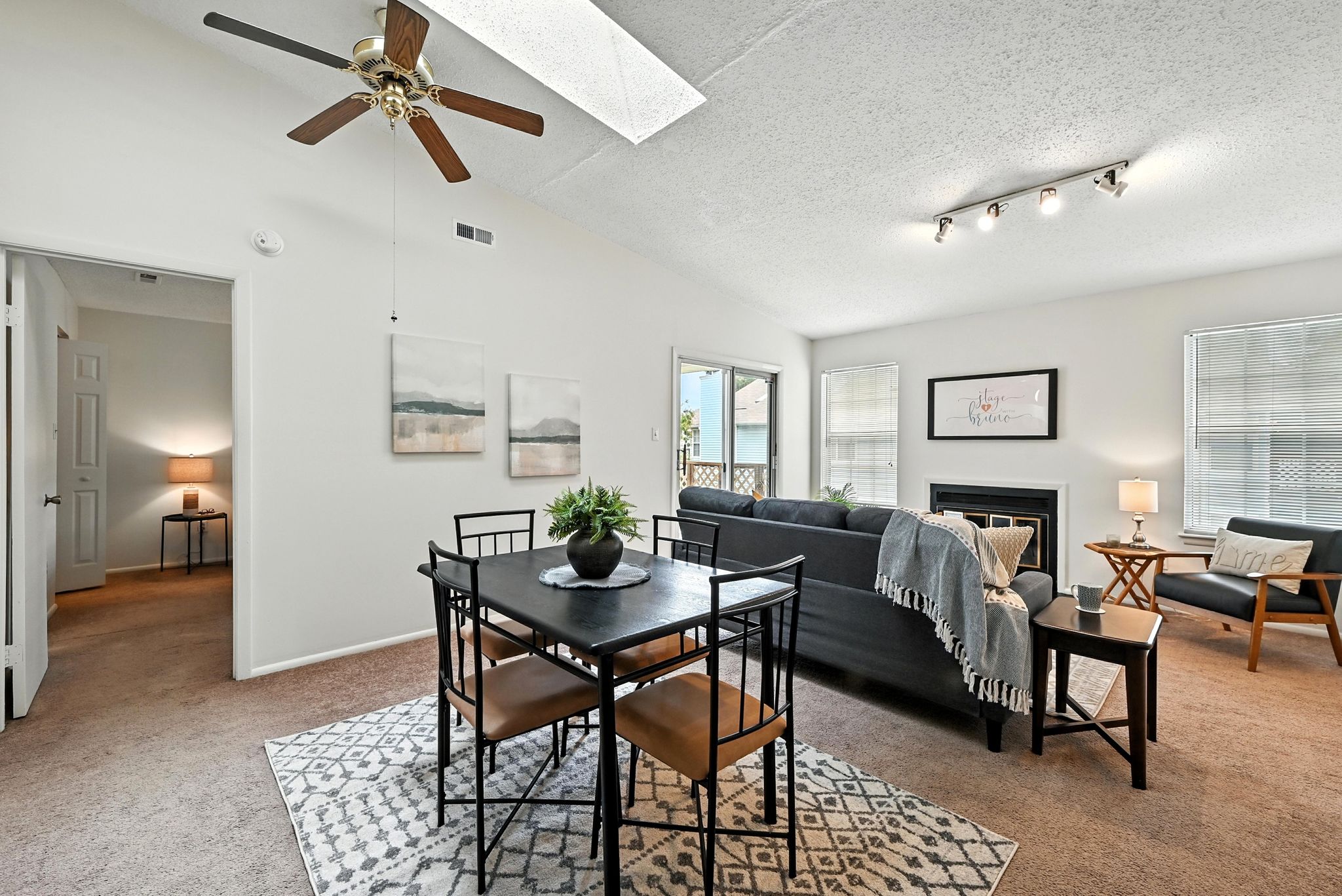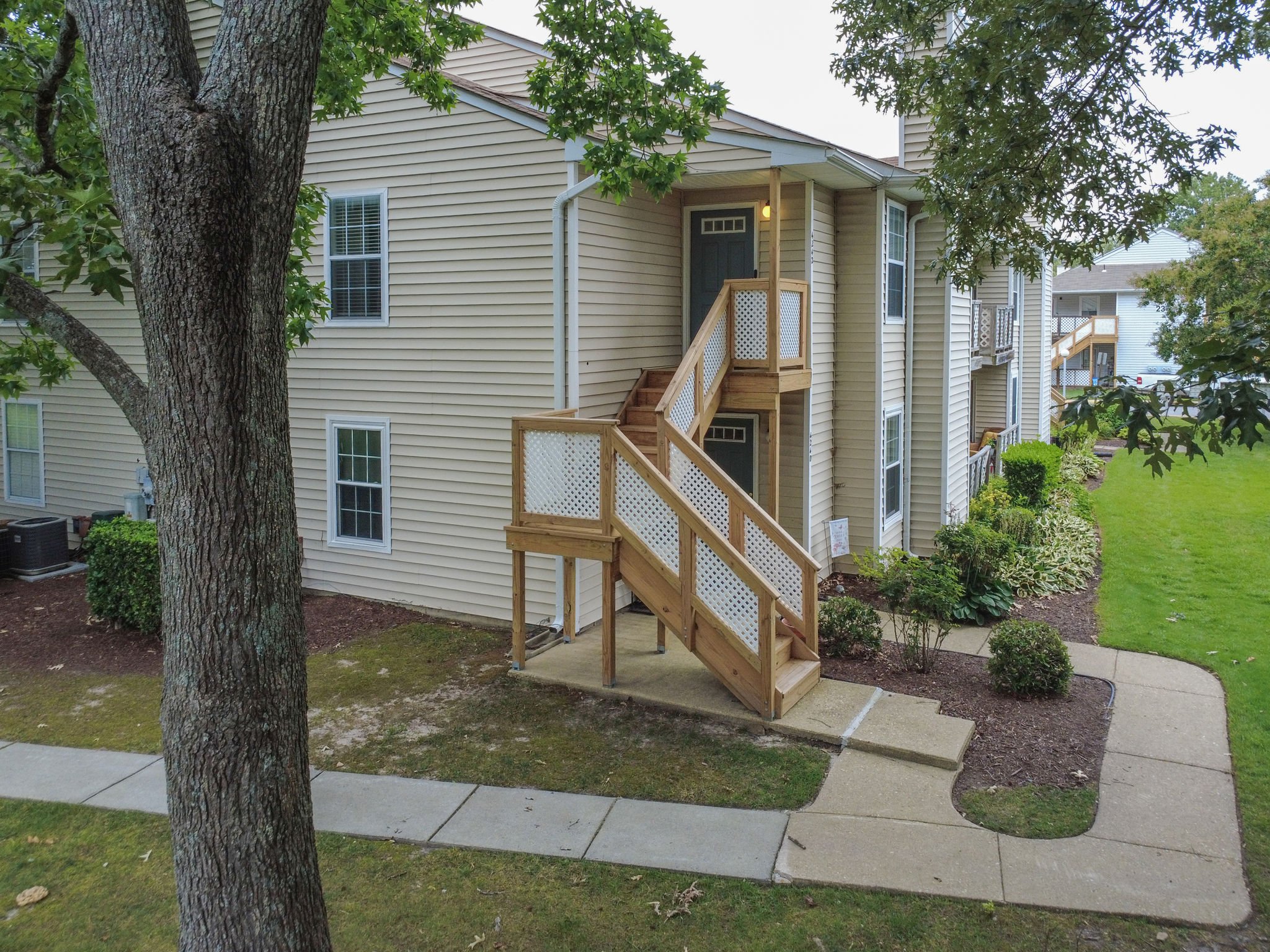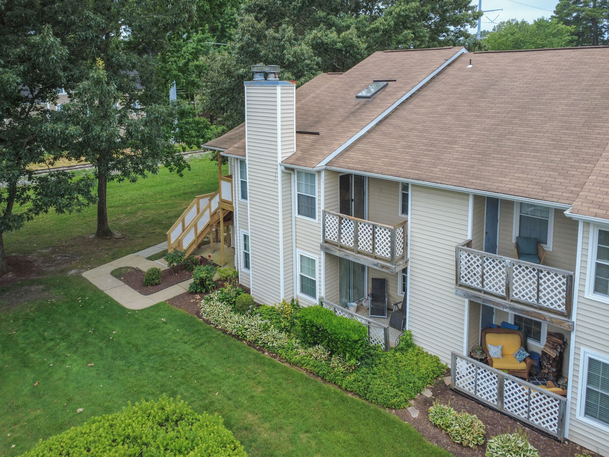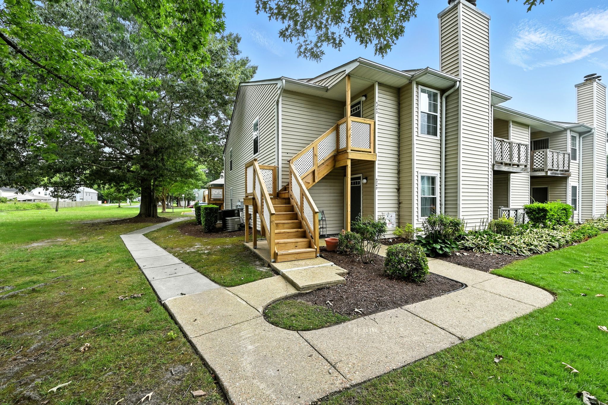 Welcome to this move-in ready end-unit condo in a secure gated community in the heart of Virginia Beach! This upstairs unit offers two spacious primary suites, each with its own full bath and walk-in closet, separated by a bright central living area with vaulted ceilings a skylight and a cozy wood-burning fireplace—perfect for relaxing evenings or chilly mornings. Step onto the private balcony overlooking a peaceful green space perfect for your morning coffee or evening unwind. Located within walking distance to shopping, dining, and local cafes, and just minutes from Town Center and the Oceanfront. Enjoy easy access to interstates and military bases. Community amenities include a clubhouse, pool, water, sewer, trash, and grounds maintenance. Live comfortably with privacy, convenience, and lifestyle all in one place!